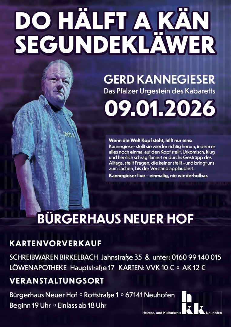 "Do hälft a kän Segundekläwer", sagt der Pfälzer Ur-Kabarettist Gerd Kannegießer und stellt in seinem Programm die Welt wieder richtig herum, indem er alles noch einmal auf den Kopf stellt. Am Freitag, 9. Januar 2026, 19 Uhr, gastiert er im Bürgerhaus Neuer Hof in Neuhofen. Karten gibt es im Vorverkauf bei Schreibwaren Birkelbach, Jahnstraße 35, in der Löwen-Apotheke, Hauptstraße 17, oder unter 0160 99 140 015.